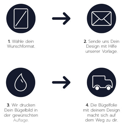Unsere Bügelbilder kannst du in folgenden Maßen ganz einfach bestellen: DIN A4, DIN A3 und als Meterware!