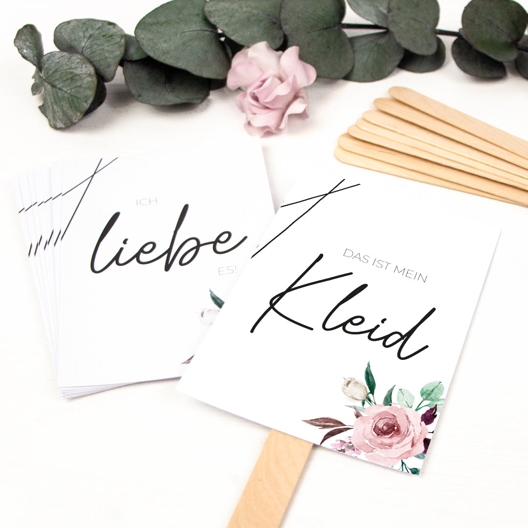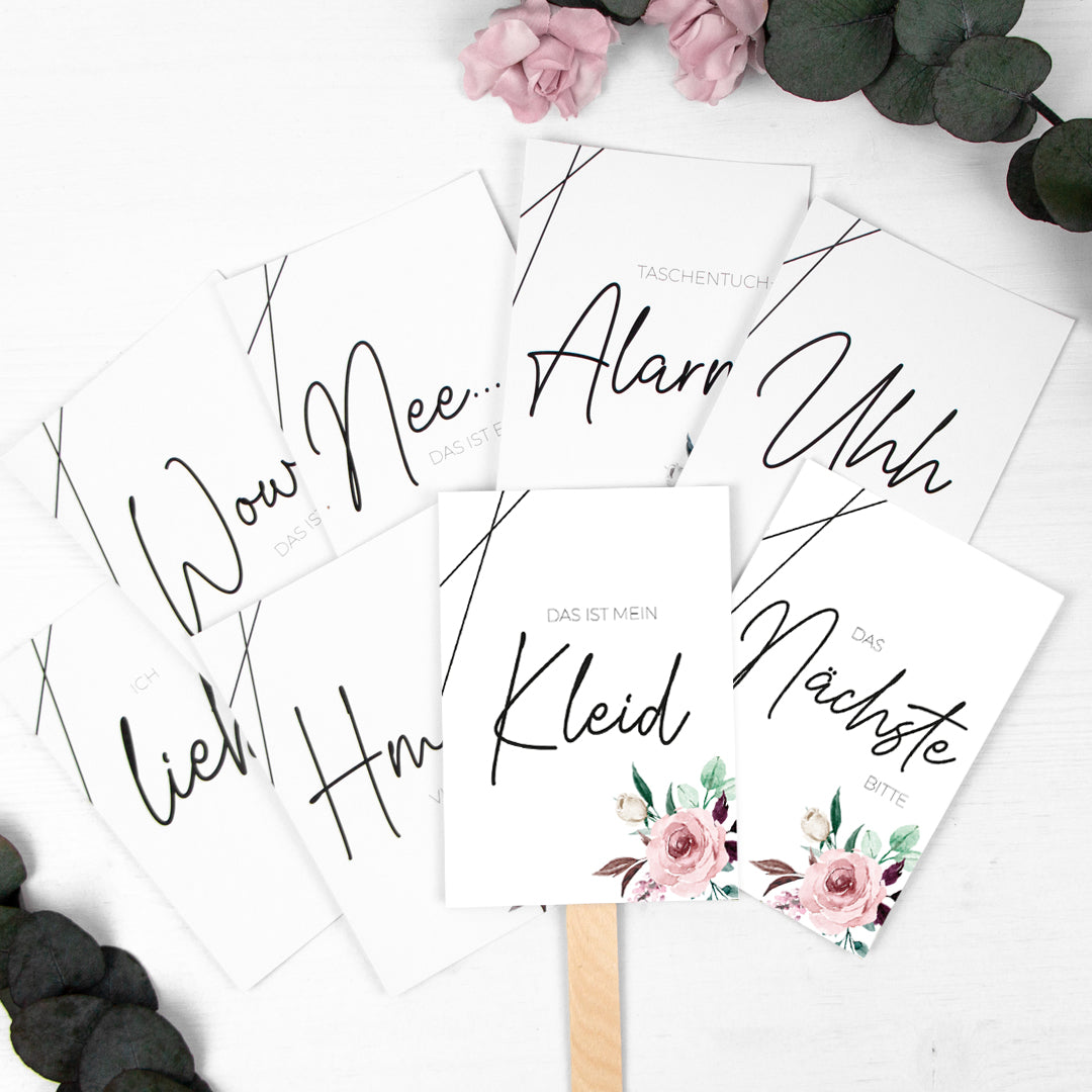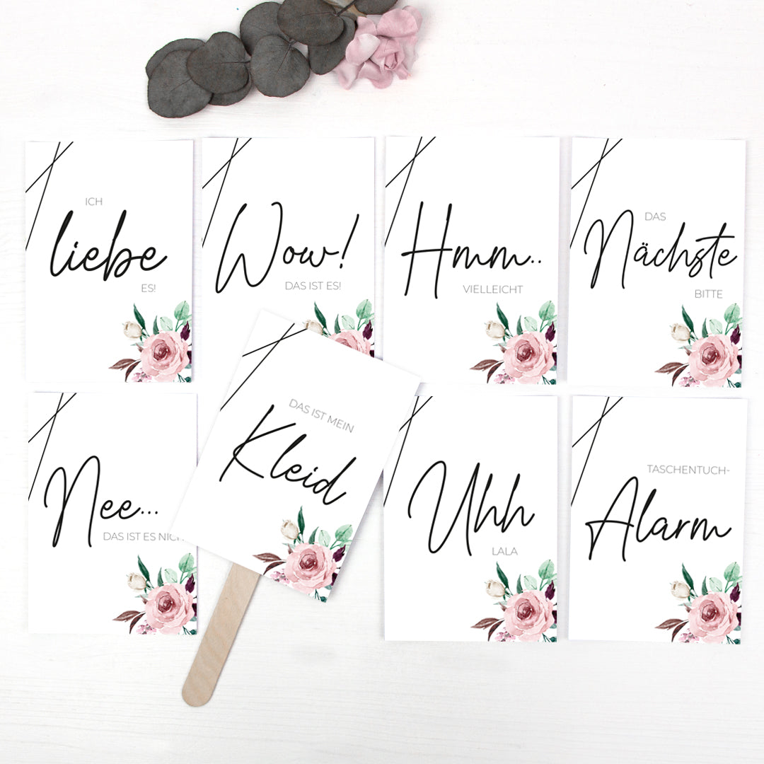 Du hast JA zu deinem liebsten Schatz gesagt? Nun wird es Zeit mit deinen Mädels und/oder deiner Familie loszuziehen und so lange hübsche Kleider anzuprobieren, bis du das eine Kleid findest zu dem du dann ebenfalls ganz laut JA sagst! Deine Freundinnen, Mama und Schwiegermama haben dazu natürlich auch eine Meinung. Diese können sie dir mit diesen hübschen Karten zeigen. Aber am Ende zählt nur eins: Nämlich, dass es DEIN Traumkleid ist! Und dann heißt es: Holt den Sekt! She said yes to the Dress! Übrigens: Die Holzstäbchen zum Selbstankleben sind direkt mit dabei!