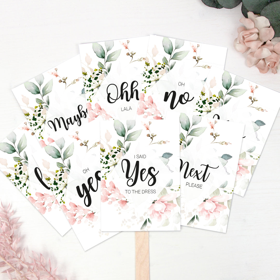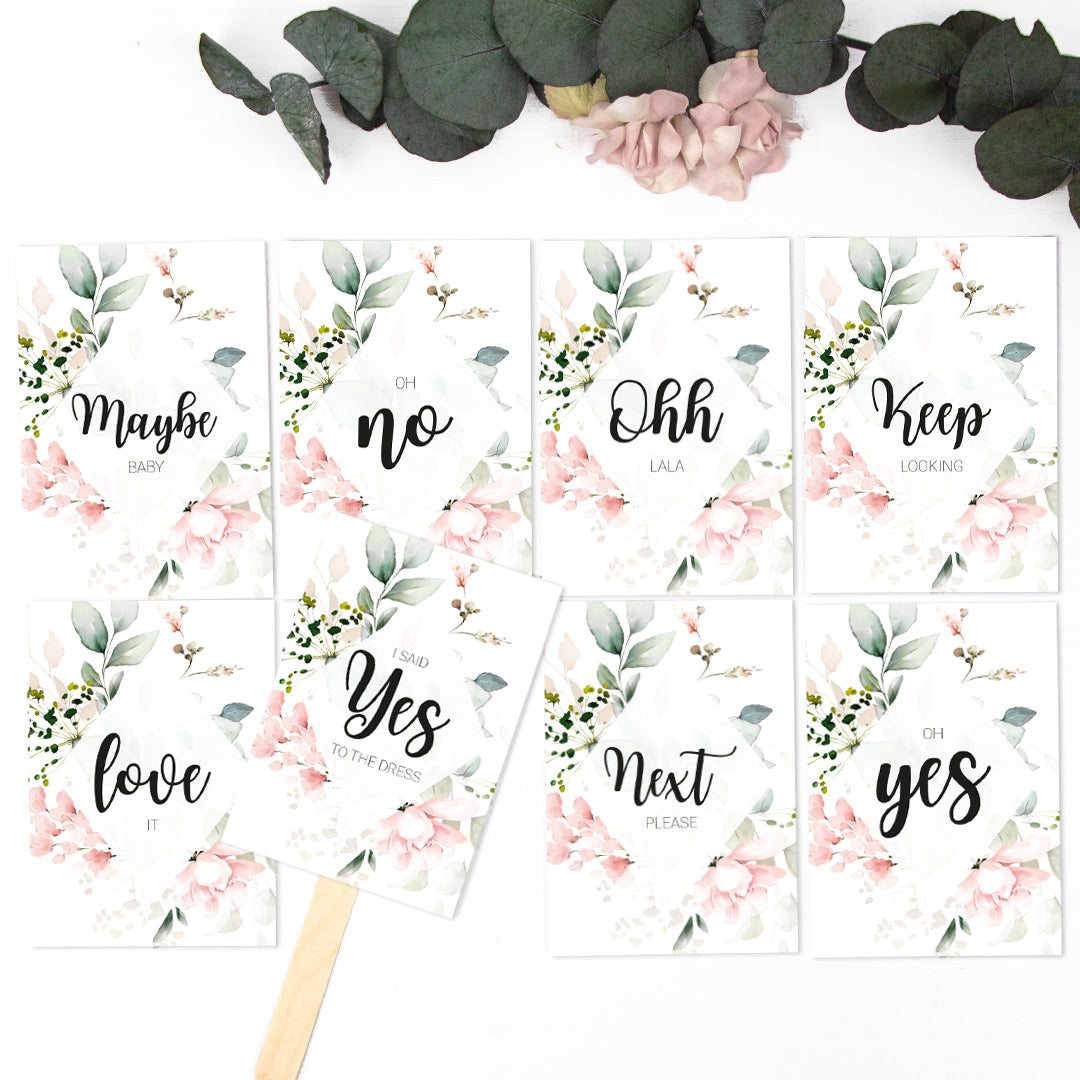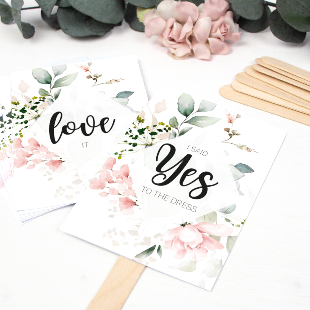 Du hast JA zu deinem liebsten Schatz gesagt? Nun wird es Zeit mit deinen Mädels und/oder deiner Familie loszuziehen und so lange hübsche Kleider anzuprobieren, bis du das eine Kleid findest zu dem du dann ebenfalls ganz laut JA sagst! Deine Freundinnen, Mama und Schwiegermama haben dazu natürlich auch eine Meinung. Diese können sie dir mit diesen hübschen Karten zeigen. Aber am Ende zählt nur eins: Nämlich, dass es DEIN Traumkleid ist! Und dann heißt es: Holt den Sekt! She said yes to the Dress! Übrigens: Die Holzstäbchen zum Selbstankleben sind direkt mit dabei!