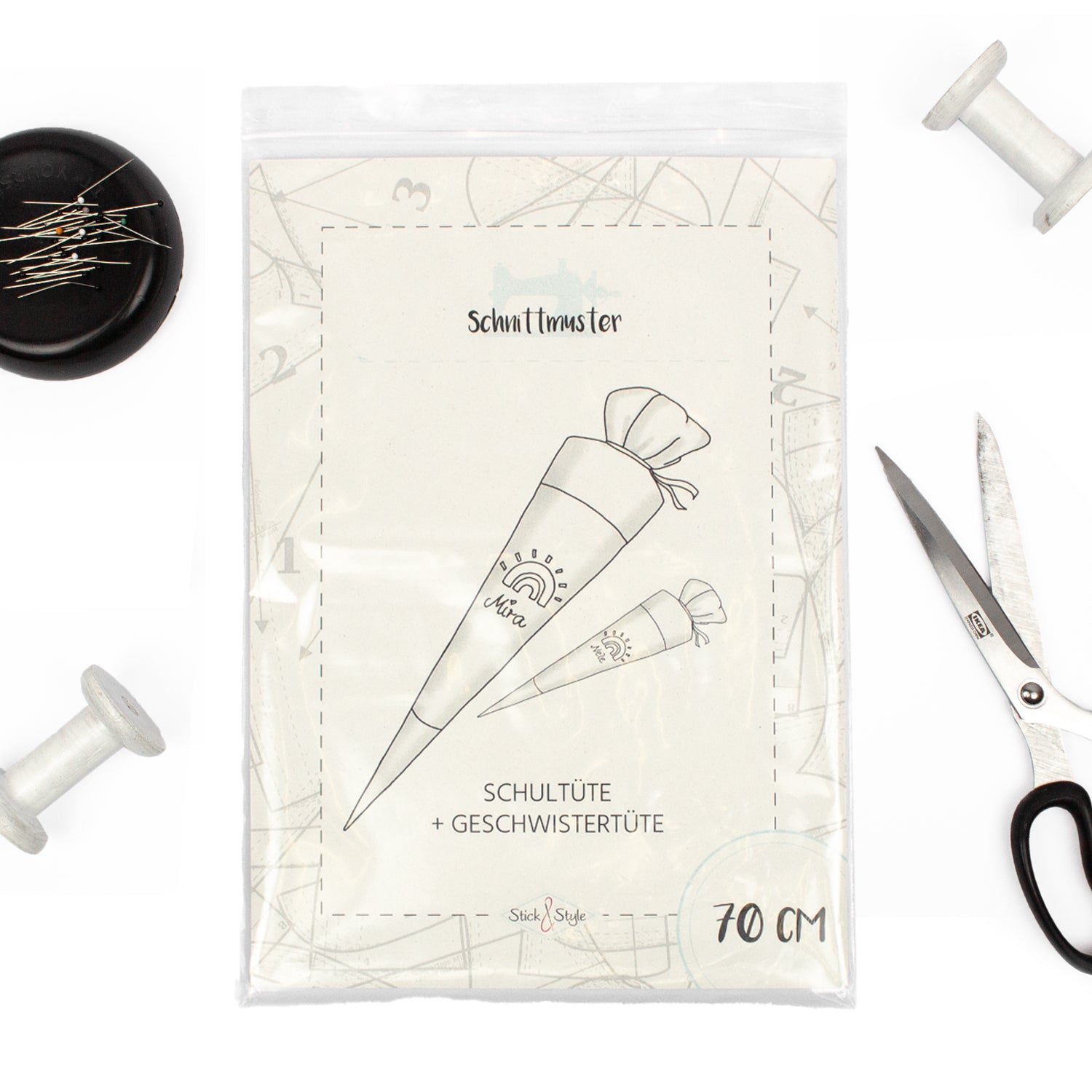 Mit diesem praktischen Papier-Schnittmuster kannst du deinem Kind ganz einfach eine ganz individuelle Schultüte selber nähen. Dieses Schnittmuster ist für eine 70 cm Schultüte geeignet und wird auf einen Großdruckformat-Papierschnittmuster-Bogen gedruckt und dir im DIN A4 Format gefaltet per Post zugeschickt. Inklusive ausführlicher Nähanleitung und Link zu unserer bebilderten Nähanleitung. Zusätzlich ist auf dem Schnittmusterbogen ein Schnitt für unsere kleine Geschwistertüte enthalten - so können sich die Geschwister gleich mit freuen. Also einfach ausschneiden und losnähen!