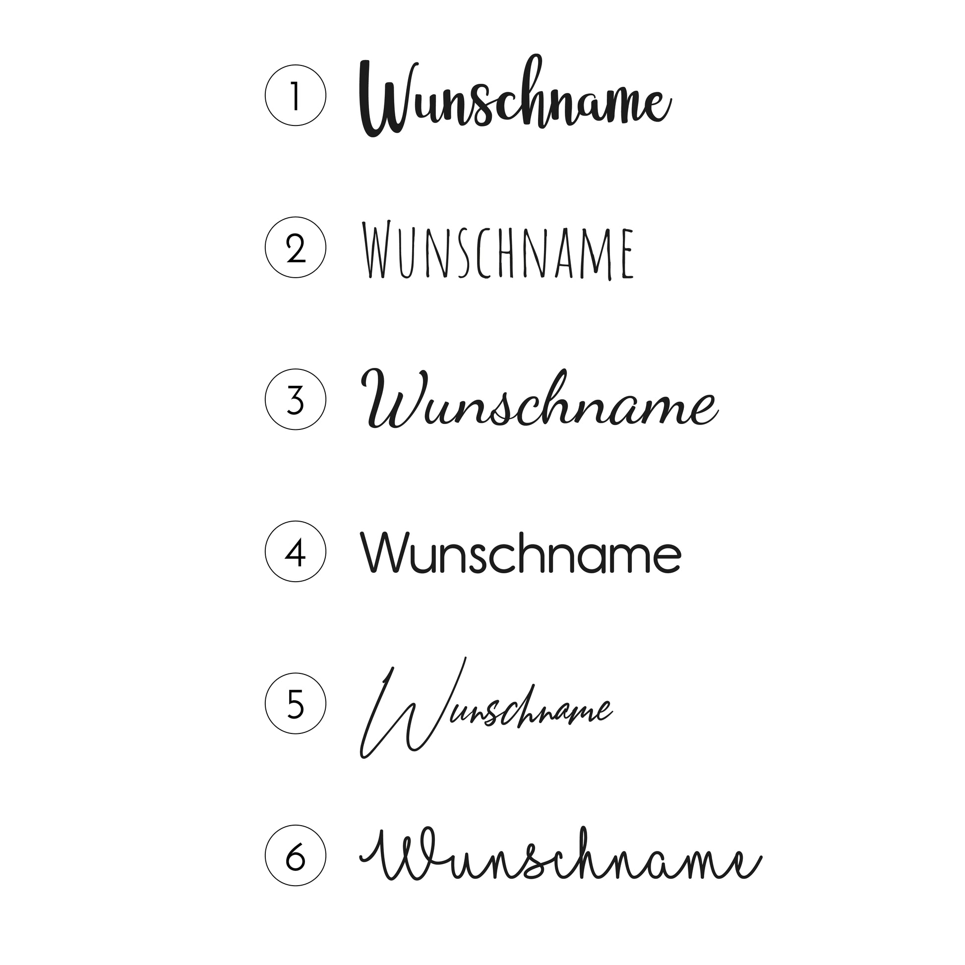 Gib hier optional deinen Wunschnamen und (!) die gewünschte Schriftart (siehe Produktbild) ein, wenn du die Option mit Bestickung gewählt hast.