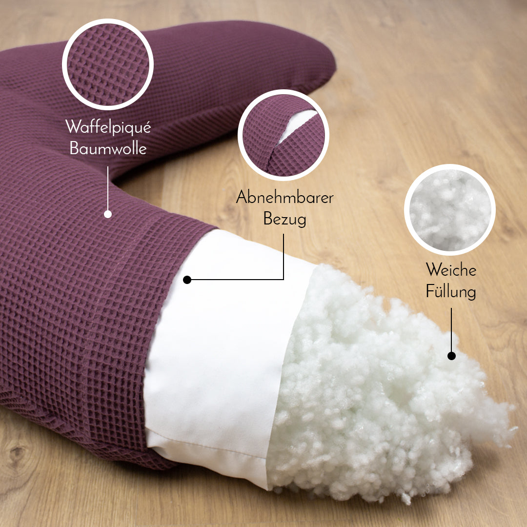 Unser Stillkissen aus Waffelpiqué (100% Baumwolle) ist der perfekte Begleiter für die Schwangerschaft und die Zeit danach. Waffelpiqué ist sehr strapazierfähig, pflegeleicht, atmungsaktiv und saugfähig. Das extra Inlett hat einen verdeckten Reißverschluss und gibt dir so die Möglichkeit die Füllmenge des Kissens genau auf deine Bedürfnisse anzupassen. Der Bezug hat einen Hotelverschluss, sodass das Kissen schön anschmiegsam ist. Die Größe von 190 cm Länge bietet viel Komfort und Flexibilität.