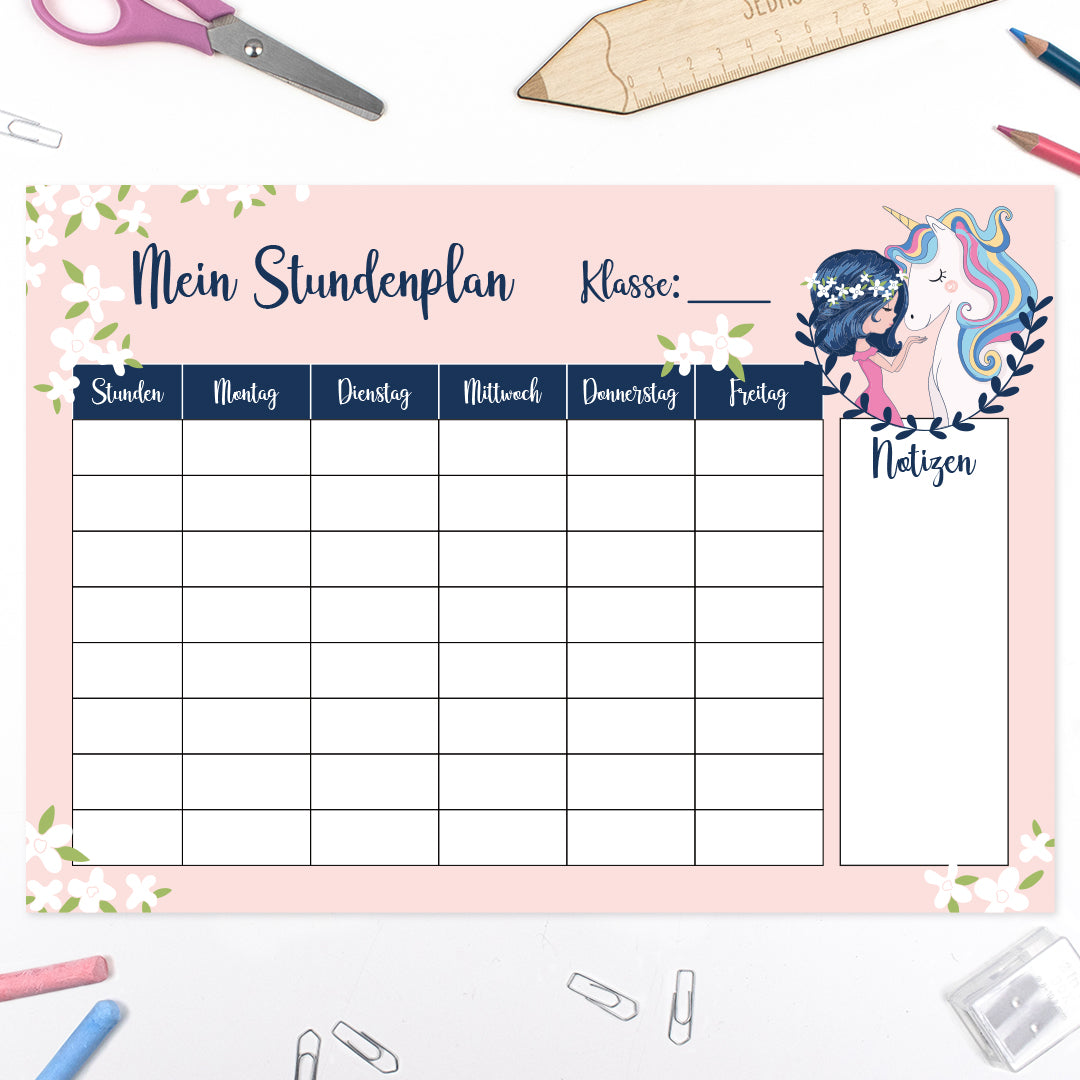 Ab jetzt ist dein Schultag perfekt organisiert und nichts gerät mehr in Vergessenheit! Unser toller Stundenplan im A4 Format bietet ausreichend Platz zum Beschriften und passt perfekt ins Schulheft oder an den Kühlschrank. Die großen Felder bieten ausreichend Platz zum Beschriften – ideal auch als Geschenk zum Schulanfang oder zum Befüllen deiner Schultüte!
