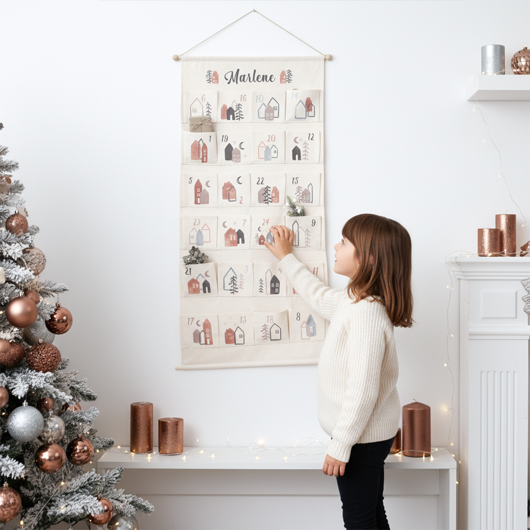 Du möchtest deinen Kindern, deinem Partner oder deiner besten Freundin dieses Jahr mal einen ganz besonderen Adventskalender schenken und dafür einen mit vielen persönlichen kleinen Geschenken selbst befüllen? Dann ist unser Wandkalender mit liebevoll gestalteten Motiven genau das richtige für dich! Die 24 Adventskalender Taschen haben genau die richtige Größe für deine individuellen Geschenke zur Weihnachtszeit. Von süßen Leckereien bis zu weihnachtlichen Aufmerksamkeiten findet hier alles seinen Platz und unser Kalender verleiht jedem Raum direkt eine festliche Weihnachtsatmosphäre. Nachhaltigkeit liegt uns am Herzen – unseren Kalender zum Aufhängen kannst du jedes Jahr wiederverwenden und einfach neu befüllen. Und das Beste: Du kannst unseren Adventskalender mit deinem Wunschnamen personalisieren! So hat jedes Familienmitglied seinen ganz persönlichen Kalender.