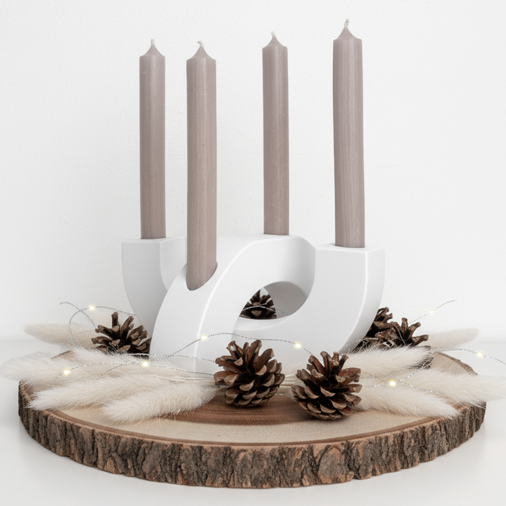 Advent mal anders – mit diesem nachhaltigen Adventskranz handmade aus Rheinland-Pfalz. Dieser handgefertigte Adventskranz vereint skandinavische Eleganz mit modernem Minimalismus. Aus hochwertigem Gießbeton gefertigt, bestehen die zwei geschwungenen Halbkreise aus einer zeitlosen Designform, die sich perfekt in jeden Wohnraum einfügt. Die schlichte Ästhetik lässt Platz für vier Kerzen, die warmes Licht in die Adventszeit bringen. Ideal für alle, die schlichte moderne Weihnachtsdeko lieben - Boho-Charme trifft auf puristische Schönheit. Jedes Stück ist ein Unikat, das mit Sorgfalt entstanden ist und lange Freude bereitet.